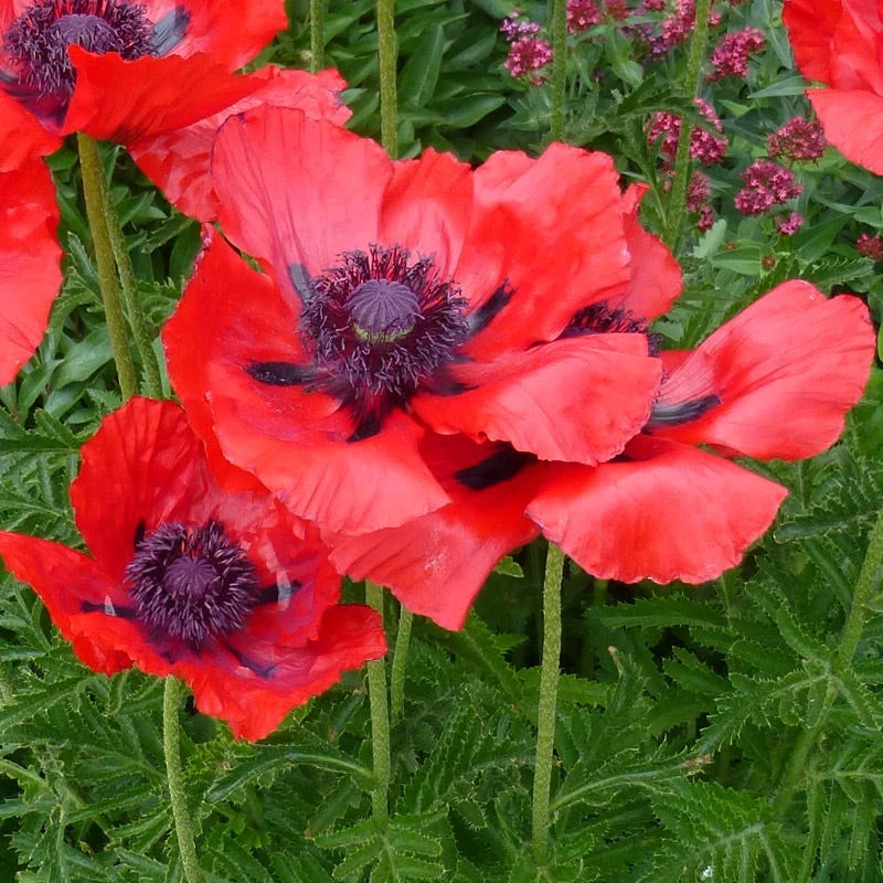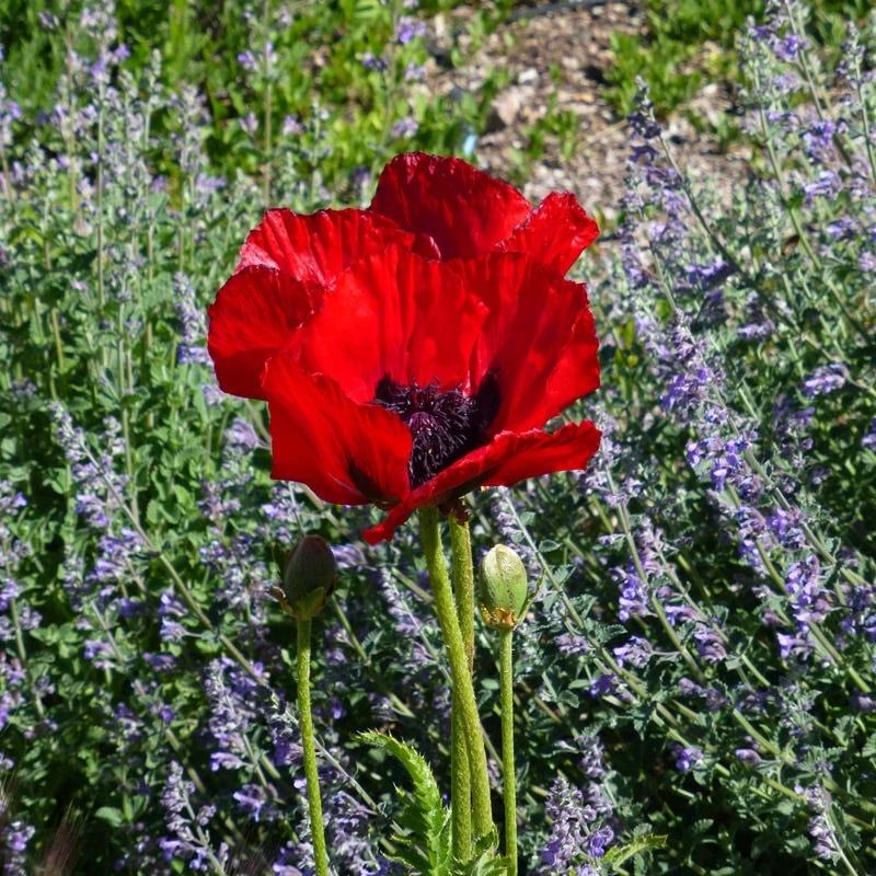 Papaver orientale ‘Beauty of Livermere’ (Oriental Poppy) blooms in late spring with huge deep red flowers. This oriental poppy is an outstanding seed grown variety.