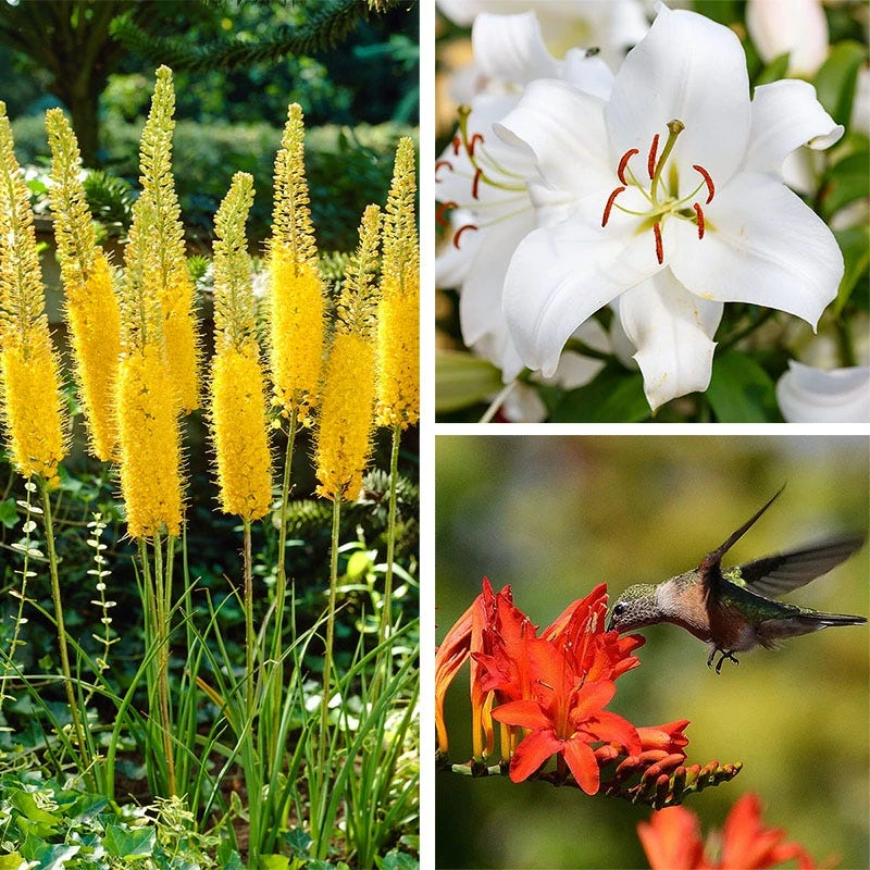 Wake up the summer doldrums with our Bold And Hardy Collection of spring planted, summer-blooming bulbs. These hardy bloomers will add delightful texture, color, and form to a sunny space or perennial garden. Not fussy, they are low-care perennials that are deer resistant, pollinator favorites. Foxtail Lily (Eremurus stenophyllus) flowers from June through July at a compact height of 2-3′ making it a perfect companion to the deep scarlet blooms of ‘Lucifer’ Crocosmia. ‘Big News®’ Oriental Lily blooms in mid-summer with pure white, fragrant flowers. All of these beauties make lovely cut flowers too. Three varieties, 16 bulbs total.
