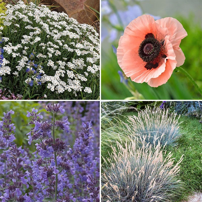 Our Elegant Elevation Collection is an easy-to-grow solution for high elevation gardens. ‘Walker’s Low’ Nepeta and Greek Yarrow will fill out quickly, lending the garden a mature look and creating a wonderful foundation for a new planting. Attractive ‘Boulder Blue’ Fescue Grass offers vertical structure and a soothing blue-green color to complement the garden scheme. ‘Princess Louise’ Oriental Poppy adds a delicate touch with the tissue-paper texture of the blooms – but don’t worry, these perennials are super tough and cold-hardy. These easy-to-grow plants are perfect for enhancing your waterwise garden or starting anew.
