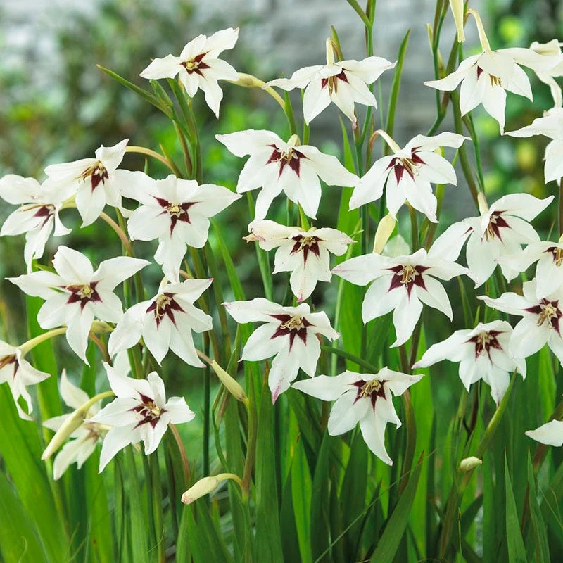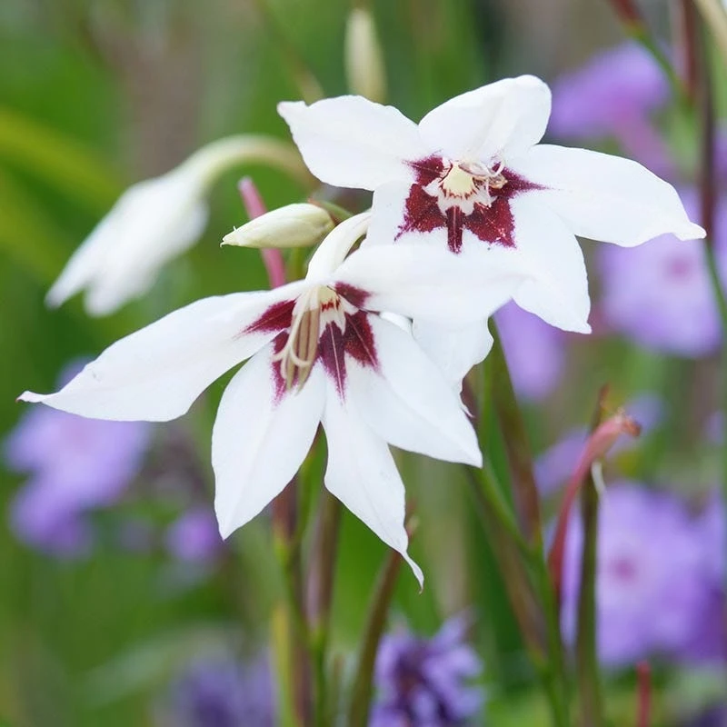 Gladiolus acindanthera (Peacock Orchid) is beautiful South African wild flower. This Gladiola blooms in mid-summer with graceful spikes of flowers. They have a strong, sweet fragrance and make wonderful bouquets. Cold hardy in zones 8-10. In colder zones lift the bulbs in fall and store in a cool place over the winter.