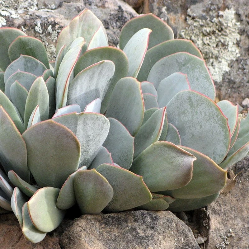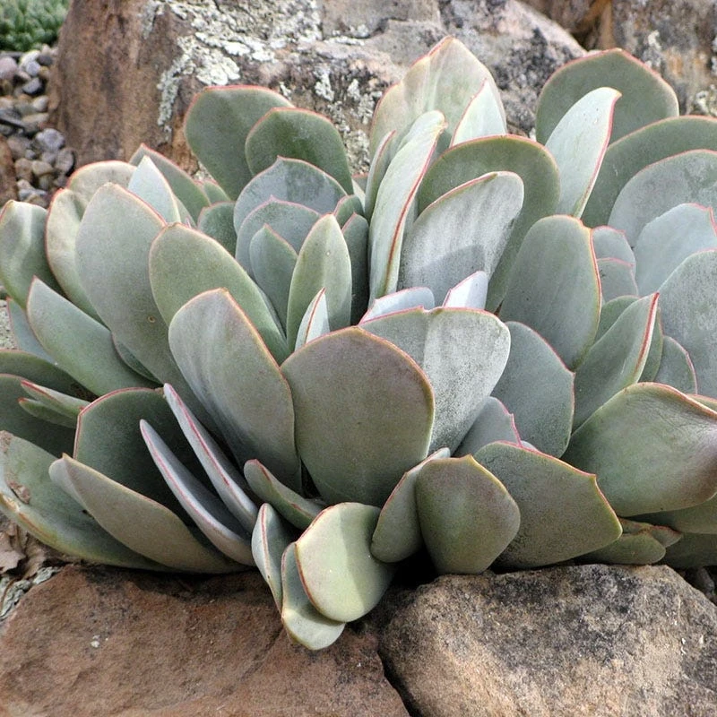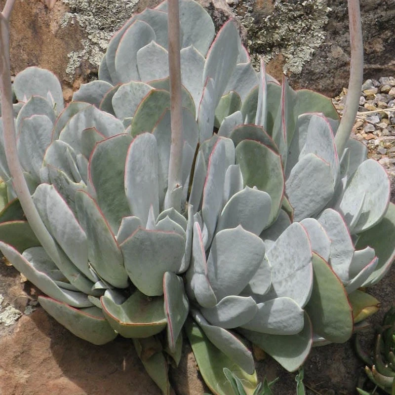 Cotyledon orbiculata (Pig’s Ear) has large disk-like silver leaves, edged in red, grow on short stubby stems. Mature plants bloom in summer with candelabras of dusky pink flowers that sit high above the foliage. Excellent as a long-lived container plant for outdoor patios and other garden spaces, it can be brought indoors for winter. Or grow it in a rock garden with excellent drainage and protection from extreme cold. A widespread species native throughout much of South Africa, our collection originates from the highest mountains in the country, the Drakensbergs.