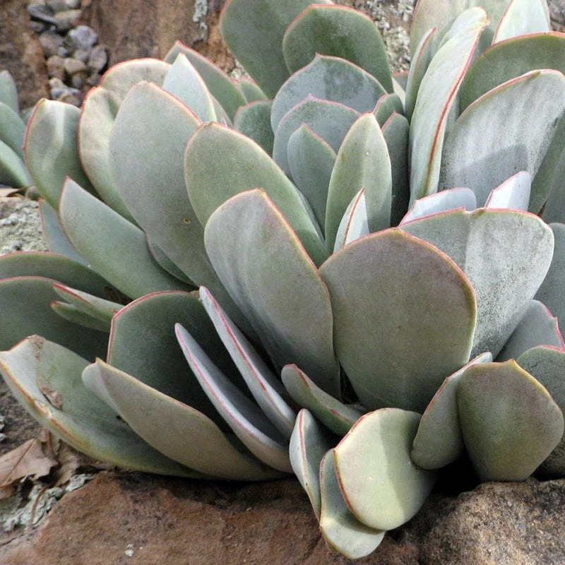 Cotyledon orbiculata (Pig’s Ear) is a showy, cold hardy succulent with rounded silver, red-edged leaves. The plant blooms in mid-summer with showy, nodding dusky-pink flowers held on sturdy upright stems.