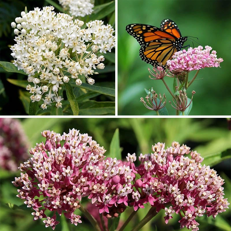 The ‘Swamp Milkweed Collection’ features a trio of long-lived native perennials with pink and white flowers. Asclepias, or Milkweed, are sun loving plants that are essential perennials for monarch butterflies providing food for caterpillars and nectar for adult butterflies. They bloom from mid-summer into early fall and, with their milky sap, are resistant to rabbits and deer. ‘Rose’ Swamp Milkweed will spread more slowly that its relatives, making it a better candidate to include in traditional perennial garden beds. Milkweed can be slow-growing, and slow to wake up from dormancy in spring, but these long-lived perennials are essential for the survival of monarch butterflies, and long-lived once established! We highly recommend giving these beauties a place in your garden. Mature plants range from 36-48″ tall x 24-36” wide.